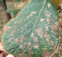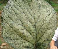 4月中旬,病原菌由葉背面開始侵染,為侵染的初期。5-6月份,氣溫20-24℃,更有利于侵染,此時期是侵染高峰期。7-8月為發(fā)病高峰期(此時期高溫高濕)葉部癥狀明顯,開始是小病斑,后逐步擴大,葉片后期干枯,大量落葉。到8月下旬開始大量落果。