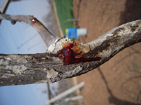 可在發(fā)病獼猴桃植株上發(fā)現(xiàn)病斑,病斑皮層隆起,組織變軟呈水漬狀,先為淡黃色,以后變?yōu)榧t褐色,病斑處出現(xiàn)小孔,流出白色液體,不久轉(zhuǎn)成鐵銹紅色,影響枝蔓營養(yǎng)輸導,使枝蔓上部的枝、葉、果生長不良。