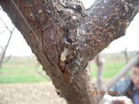 冬季在樹體病枝上越冬,或者隨病枝病葉等殘體在土壤中越冬;第二年春季溫度4-20攝氏度時發(fā)病,3-4月最為嚴重,到5月份隨氣溫升高而減輕。
