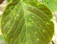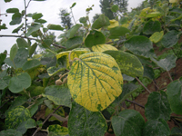 獼猴桃病毒病有獼猴桃花葉病。。表現(xiàn)為葉部有鮮黃色不規(guī)則線狀或片狀斑,病健部交界明顯,葉脈和脈間組織均可以發(fā)病,嚴重影響葉片的光合功能。