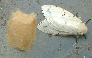 成蟲 雌雄異型,雄體長(zhǎng)18-20mm,翅展45-47mm,暗褐色。頭黃褐色,觸角羽狀褐色,干背側(cè)灰白色。前翅外緣色深呈帶狀,余部微帶灰白,翅面上有4-5條深褐色波狀橫線;中室中央有l(wèi)黑褐圓斑,中室端橫脈上有4黑褐“<”形斑紋,外緣脈間有7-8個(gè)黑點(diǎn)。后翅色較淡,外緣色較濃成帶狀,橫脈紋色暗。雌體長(zhǎng)25-28mm,翅展70-75mm,污白微黃色。觸角黑色短羽狀,前翅上的橫線與斑紋同雄相似,為暗褐色;后翅近外緣有1條褐色波狀橫線;外緣脈間有7個(gè)暗褐色點(diǎn)。腹部肥大,末端密生黃褐色鱗毛。