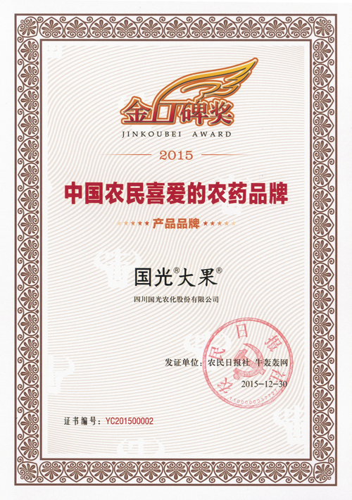 “2015中國農(nóng)民喜愛的農(nóng)藥品牌”大型公益調(diào)查活動在2015年10月22日啟動,通過農(nóng)民日報等機構(gòu)調(diào)查,國光“大果”榮獲2015中國農(nóng)民喜愛的農(nóng)藥品牌稱號。