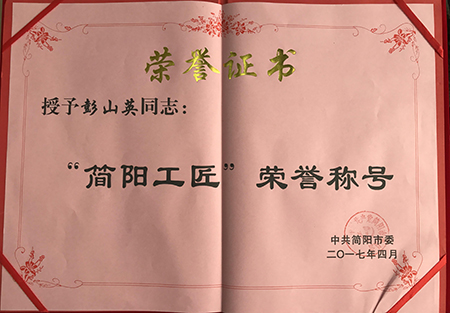 研發(fā)部彭山英榮獲2017年首屆“簡陽工匠”稱號