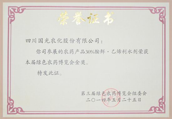 2014年5月25日,由中國農(nóng)藥發(fā)展與應(yīng)用協(xié)會(huì)主辦的第三屆綠色農(nóng)藥博覽會(huì)在山東濰坊舉辦。依據(jù)《中國綠色農(nóng)藥博覽會(huì)參展農(nóng)藥評(píng)選辦法》,經(jīng)過第三屆綠色農(nóng)藥博覽會(huì)組委會(huì)認(rèn)真評(píng)選,“國光30%胺鮮·乙烯利水劑”榮獲第三屆綠色農(nóng)藥博覽會(huì)金獎(jiǎng)。這也是繼“國光0.1%三十烷醇微乳劑”獲得第一屆綠色農(nóng)藥博覽會(huì)金獎(jiǎng)后再次榮獲金獎(jiǎng)。