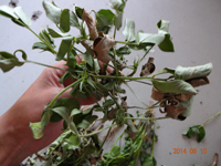 癥狀:病菌從子葉或幼根侵入植株,在根頸部產(chǎn)生黃褐色水漬狀病斑,后變黑褐色,引起根基組織腐爛。當(dāng)潮濕環(huán)境時(shí),病部產(chǎn)生分生孢子器(即黑色小突起),病部表皮易剝落,纖維組織外露。當(dāng)環(huán)境干燥時(shí),病部表皮凹陷,緊貼莖上,成株期感病后,約10~30天全株枯死,發(fā)病部位多在莖基部貼地面,有時(shí)也出現(xiàn)主莖和側(cè)枝分期枯死現(xiàn)象。