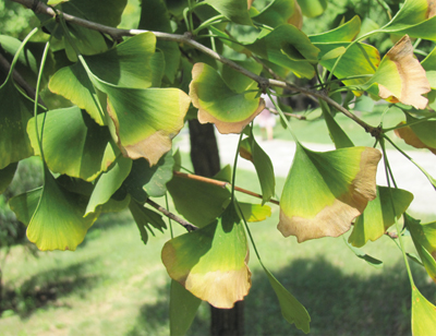 近年來,該銀杏樹出現(xiàn)樹勢(shì)衰弱的情況,銀杏葉片小,甚至部分枝條不發(fā)葉的情況,較多老葉邊緣出現(xiàn)焦枯的現(xiàn)象;林業(yè)部門立即聯(lián)系國光名木古樹救護(hù)人員,邀請(qǐng)技術(shù)員到現(xiàn)場(chǎng)對(duì)古銀杏進(jìn)行診斷。通過現(xiàn)場(chǎng)檢測(cè)發(fā)現(xiàn)古銀杏根部的土壤通透性差,土壤PH值偏堿,土壤中有機(jī)質(zhì)缺乏;挖開根部的土壤,觀察發(fā)現(xiàn),古銀杏根系有腐爛的情況,根部土壤水分含量較高;較多葉片出現(xiàn)邊緣焦枯的現(xiàn)象(圖1)。