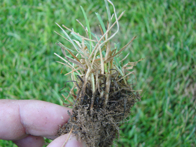 拔出“剛”感病的草坪草,發(fā)現(xiàn)根部、根莖部已黑褐色腐爛,且植株會(huì)輕輕拔起