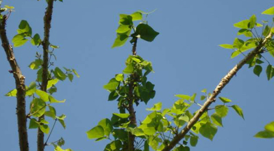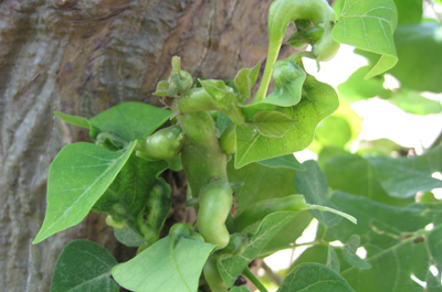 刺桐姬小蜂專一危害刺桐屬植物,該蟲(chóng)生殖能力很強(qiáng),通常一旦出現(xiàn)輕微感染,短時(shí)間內(nèi)便會(huì)擴(kuò)散到全株。刺桐姬小蜂將卵產(chǎn)于刺桐嫩葉和葉柄組織內(nèi), 幼蟲(chóng)在植物組織內(nèi)生長(zhǎng)發(fā)育。由于植物組織受到幼蟲(chóng)唾液分泌物刺激而增生, 呈水泡狀膨大, 并在葉片背面和葉柄上形成瘤狀蟲(chóng)癭。蟲(chóng)癭很快蔓延到全株, 致使全株葉片組織膨大,發(fā)展形成畸形、卷曲的病葉,嚴(yán)重影響整體景觀效映。幼蟲(chóng)在蟲(chóng)癭內(nèi)化蛹, 羽化的成蟲(chóng)從蟲(chóng)癭的羽化孔飛出。姬小蜂除了造成蟲(chóng)癭, 使枝葉膨大、扭曲變形, 降低刺桐的觀賞價(jià)值外, 還會(huì)使形成蟲(chóng)癭的枝、葉和旁邊的嫩枝、嫩芽枯死,葉片脫落。新發(fā)的葉片、嫩枝不斷受到感染, 無(wú)法長(zhǎng)出健康的枝葉進(jìn)行光合作用,到后期直接造成刺桐樹(shù)死亡。