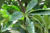 2、根據(jù)調(diào)查發(fā)現(xiàn),成蟲(chóng)產(chǎn)卵期和若蟲(chóng)危害期與盆架子新芽、新葉的生長(zhǎng)期吻合,因此針對(duì)易發(fā)區(qū)域,應(yīng)建議在新葉萌發(fā)期普遍噴施內(nèi)吸性的農(nóng)藥如崇刻(50%啶蟲(chóng)脒水分散粒劑)2000-3000倍進(jìn)行預(yù)防。若已經(jīng)被危害的區(qū)域,鑒于木虱危害的隱蔽性以及噴藥難以接觸蟲(chóng)體的特點(diǎn),建議選用內(nèi)吸滲透性藥劑,且最好在葉面出現(xiàn)“包狀物”而葉背面未出現(xiàn)黑褐色羽化孔前噴霧,建議用 “必治”(稀釋1000倍)與“依它(稀釋1000倍)”混合液葉面噴施,連用2-3次,間隔5-7天噴一次; 此方案用藥前后的對(duì)比如下(見(jiàn)圖4、圖5)。